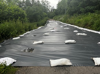 Fotos (Stadt Geislingen): Der Kolpingweg ist abgerutscht. Die Straße ist derzeit mit einer Folie abgedeckt,um weiteres Eindringen von Wasser zu verhindern.