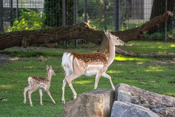 In der Asiatischen Huftieranlage der Wilhelma ist Ende Juni 2024 eine kleine Rarität zur Welt gekommen: Bei den Mesopotamischen Damhirschen wurde ein Jungtier geboren. Für viele ist es einfach ein emotional berührender Anblick,wie das weibliche Kalb mit seinem gefleckten Fell von seiner Mutter durch das Gehege geführt wird. Immer wieder hört man von den Besuchenden der Wilhelma entzückte Stimmen wie „Oh,ein Bambi!“.