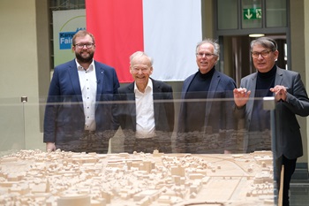 Ende Januar kamen sie alle nochmals an ihrer früheren Wirkungsstätte zusammen und blickten vor dem Stadtmodell im Atrium des Rathauses auf „ihre“ Stadt. Die ehemaligen Oberbürgermeister Hans Haller,Reinhard Frank und Guido Till sowie Stadtoberhaupt Alex Maier sind derzeit Protagonisten eines entstehenden Dokumentarfilms,der Göppingen im Wandel der Zeit beleuchten wird. Entstanden ist die Idee beim Zusammentreffen der vier Oberbürgermeister anlässlich des 90. Geburtstages von Ehrenbürger Hans Haller vor zwei Jahren. Nun trafen sie bereits zum zweiten Mal vor den Kameras des Filmteams zusammen. Mehr kann aktuell noch nicht mitgeteilt werden,doch alle sind schon sehr gespannt auf das Ergebnis!