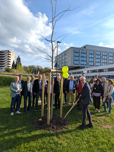 Im Zeichen der Verbundenheit mit dem landkreiseigenen Klinikum pflanzte der Verein Freunde und Förderer ALB FILS KLINIKUM e.V. am 14.04.2025 anlässlich seiner Mitgliederversammlung symbolisch einen 5,5 m hohen Baum. Mit dem Baum vor dem Eingang des Parkhauses am ALB FILS KLINIKUM soll zukünftig an die umgesetzten Projekte des Vereins erinnert werden. Für jedes Projekt wird künftig eine Plakette mit einer kurzen Projektbeschreibung an der Baumkonstruktion angebracht werden.