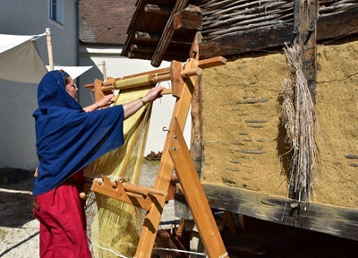 Foto (Alamannenmuseum,Ursula Maier): Am 18. Mai ist im Alamannenmuseum ein erlebnisreiches Programm für Jung und Alt mit zahlreichen Mitmachaktionen geboten * hier Antje Poppitz,die an diesem Tag am Webstuhl im Museumshof auftritt