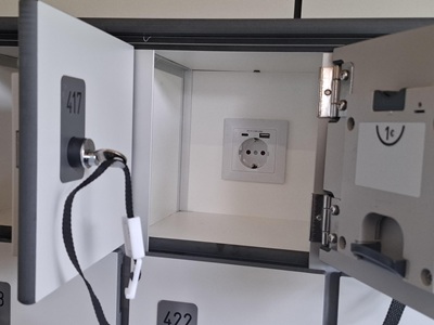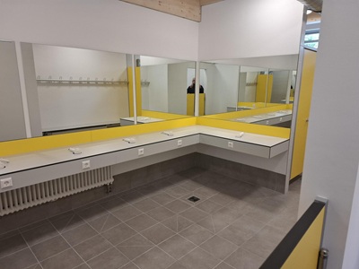 Ein weiteres Highlight ist die große,überdachte Umkleidefläche mit insgesamt 96 abschließbaren Schränken. Zusätzlich wurden zwölf spezielle Helmschränke sowie 20 Wertfächer mit integrierter Lademöglichkeit für Handys installiert – ideal für alle,die mit dem Fahrrad kommen oder ihre Wertsachen sicher verstauen möchten.