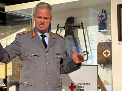 „Jede Investition in den Sanitätsdienst der Bundeswehr ist eine Investition in den Bevölkerungsschutz.“ Und: „Die Streitkräfte sind in der Landes- und Bündnisverteidigung auf das zivile Gesundheitssystem angewiesen.“ Generalarzt Dr. Bruno Most fand im Rotkreuz-Landesmuseum in Geislingen deutliche Worte,forderte,dass dafür die Hilfsorganisationen mit entsprechenden Ressourcen ausgestattet werden müssen. „Wir müssen Sie noch viel deutlicher befähigen,Ihren Aufgaben gerecht zu werden.“ Der stellvertretende Kommandeur im Kommando Sanitätsdienstliche Einsatzunterstützung sprach auf Einladung des Konventionsbeauftragten des DRK-Kreisverbandes Göppingen über „Deutschland in der Gesamtverteidigung – Erwartungen des Sanitätsdienstes der Bundeswehr an Hilfsorganisationen und das zivile Gesundheitswesen“.