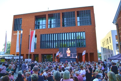 Foto (Bildquelle: Stadt Eislingen): Die Konzerte werden auf eine große LED-Wand auf den Schlossplatz übertragen. Sitzgelegenheiten sind ausreichend vorhanden.