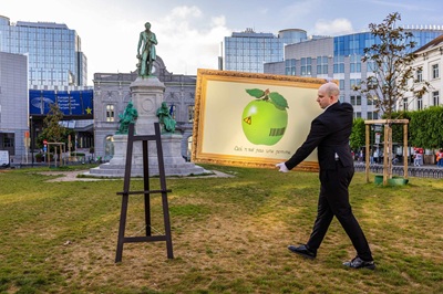 Direkt vor dem Europäischen Parlament in Brüssel enthüllten wir eine surreale Kunstinstallation,die von dem belgischen Künstler Magritte inspiriert ist. Die Botschaft: Was wie ein Apfel,ein Bauernhof oder sogar ein Bauer aussieht… ist keiner. Nicht mehr.
