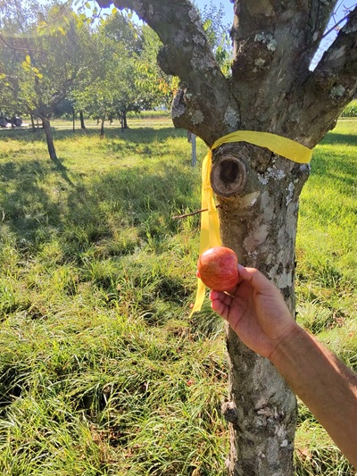 Foto (Stadt Uhingen): Von zahlreichen Bäumen,wie hier bei der Hochzeitsallee am Ortsrand von Sparwiesen,kann das Obst gepflückt werden. Allerdings nur,wenn die Bäume mit einem gelben Band markiert sind.