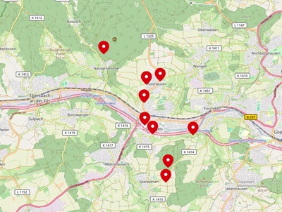 7 Apfelbäume befinden sich im Gewann Buckelwiesen unterhalb von Schloss Filseck,9 Apfelbäume und 1 Birnbaum stehen an der Heerstraße 12 im Bereich des TV Uhingen und ein weiterer Birnbaum befindet sich im Gewann Buschelfeld beim Eulenhofweg.