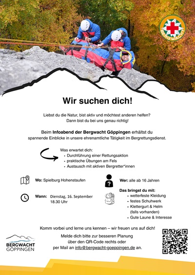 Die Bergwacht Göppingen lädt alle Interessierten herzlich zu einem Informationsabend am 16. September 2025 um 18:30 Uhr in Hohenstaufen ein
