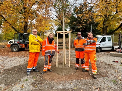 Foto (Stadtverwaltung Geislingen an der Steige / Teresa Christmann): Baumpflanzchallenge – Das Team vom Geislinger Bauhof hat einen neuen Baum eingesetzt