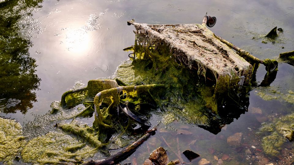 Ein Einkaufswagen ragt aus dem Rhein: Innerhalb eines Jahres haben die Freiwilligen Abfall mit einer Trockenmasse von fast zwei Tonnen gesammelt