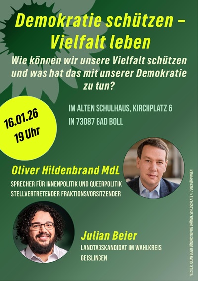 Am Freitag, 16. Januar 2026, lädt BÜNDNIS 90/DIE GRÜNEN herzlich zu einer öffentlichen Diskussionsveranstaltung ein. 🕖 19:00 Uhr 📍 Altes Schulhaus, Kirchplatz 6, 73087 Bad Boll Zu Gast ist Oliver Hildenbrand, MdL (Stellvertretender Fraktionsvorsitzender sowie Sprecher für Innenpolitik und Queerpolitik der Grünen-Fraktion im Landtag von Baden-Württemberg) und Julian Beier, Landtagskandidat im Wahlkreis Geislingen. Gemeinsam sprechen ...