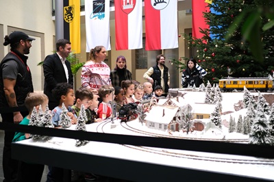 Mit einer stimmungsvollen Eröffnung ist am Freitag, 5. Dezember, die weihnachtliche Märklin-Modelleisenbahn im Atrium des Rathauses in die Adventszeit gestartet. Auf einer Fläche von 2,6 mal 4,2 Metern lädt die liebevoll gestaltete Anlage Besucherinnen und Besucher zum Verweilen und Staunen ein. Zur Eröffnung waren 25 Kinder aus dem Kinderhaus Seefrid gemeinsam mit ihrer Leiterin Sabrina ...